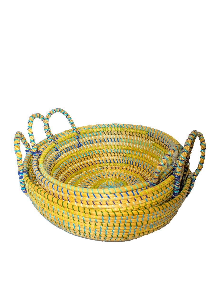 Set de tres canastos de fibra natural con manijas. En tonos celestes, verdes y natural. Medidas: 48cm x 16cm (el mas grande)