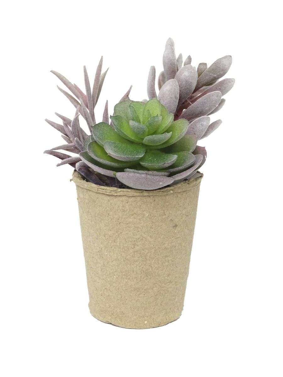 Suculenta artificial de plástico en maceta de cartón. Medidas 13.34 x 13.34 x 19.05 cm